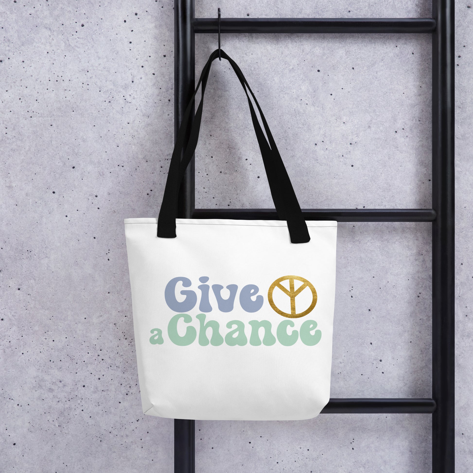 Stement-making tote bag features classic peace symbol and text "Give Peace a Chance." Durable and environmentally-friendly, made from 100% polyester with natural cotton denim handles. Certified safe from harmful substances. 15"x15" size, can hold up to 44 lbs.